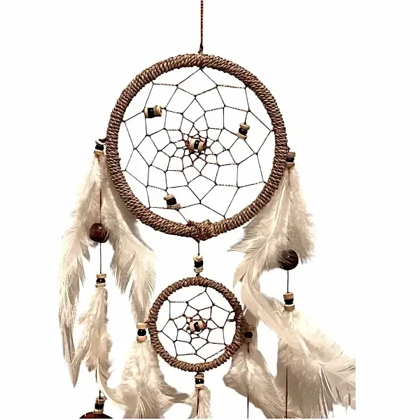 Denne drømmefanger er fremstillet af naturlig bast, kokosdetaljer, træperler og ægte fjer. Kombinationen giver et varmt, jordnært og roligt udtryk, som passer perfekt ind i både moderne og spirituelle hjem.