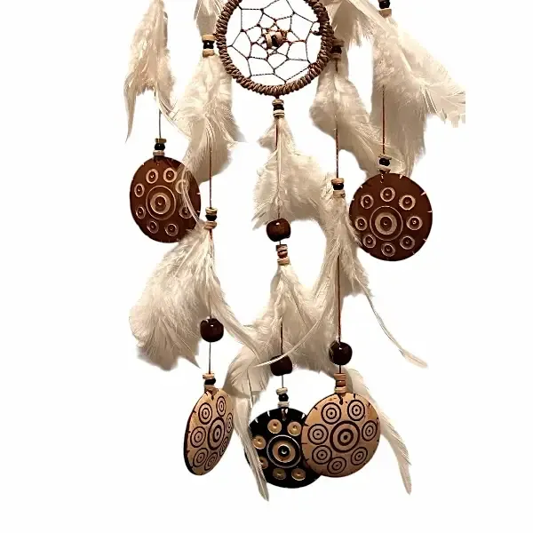 De lyse fjer symboliserer lethed og beskyttelse, mens kokos-elementerne tilfører en rå og naturlig energi, som forankrer dig og skaber balance i rummet.