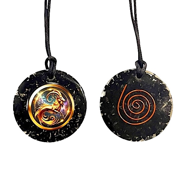 Dette orgonit vedhæng med stjernetegnet Stenbukken er et spirituelt smykke, der forener symbolik, krystalenergi og et kraftfuldt udtryk. Vedhænget måler 4 cm i diameter og leveres med en justerbar sort snøre, så det nemt kan tilpasses din personlige stil og dit energiarbejde. Smykket er skabt til at kunne bæres i hverdagen og fungere som et personligt energiredskab.