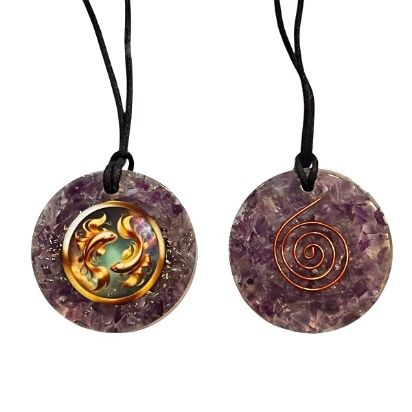 Vedhænget er dobbeltsidet med Fiskenes symbol på forsiden og en kobberspiral på bagsiden. Ametystens violette nuancer giver orgonitten et blidt og spirituelt udtryk, som harmonerer smukt med Fiskenes intuitive og drømmende energi. Smykket har et tidløst og spirituelt design og kan bæres af alle køn.