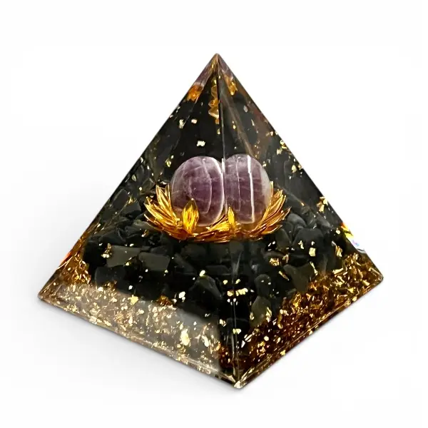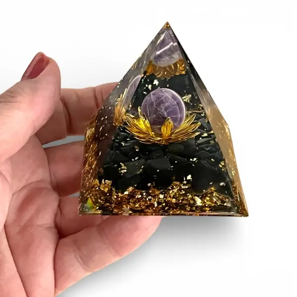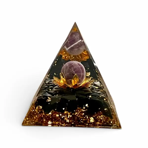 Denne orgonit pyramide er håndlavet og fremstillet med fokus på både kvalitet og æstetik. Kombinationen af sort obsidian, ametyst og lotusblomst gør den til et smukt og meningsfuldt objekt, der forener spiritualitet og indretning.