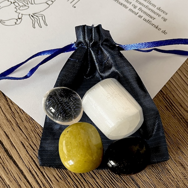 Sættet inkluderer fire nøje udvalgte krystaller – Grøn Serpentin, Bjergkrystal, Sort Turmalin og Selenit – samt et print, der viser, hvordan hver sten arbejder med Skorpionens energi og karaktertræk.