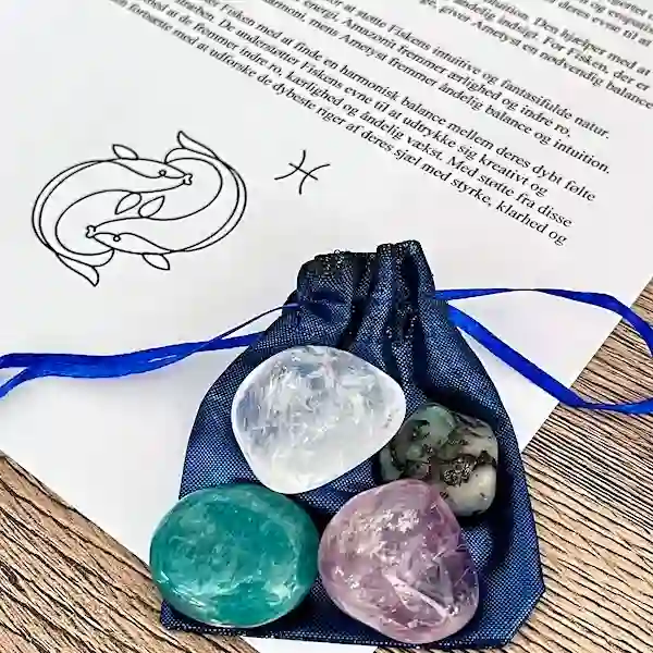 Dyk ned i den magiske verden af vores krystalsæt til Fiskens tegn, designet specielt til at harmonisere med de karaktertræk, som kendetegner Fiskene. Dette stensæt understøtter balance, indre ro og spirituel klarhed, og hjælper dig med at forbinde dig med dine intuitive og medfølende sider.
