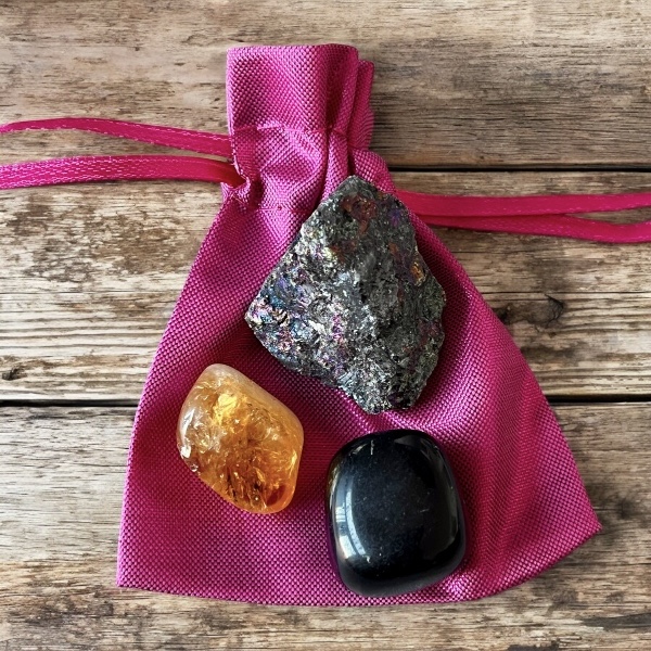 Glæde og Beskyttelse – Krystalsæt med Brændt Citrin, Calcopyrit (Påfuglesten) og Sort Obsidian 🖤