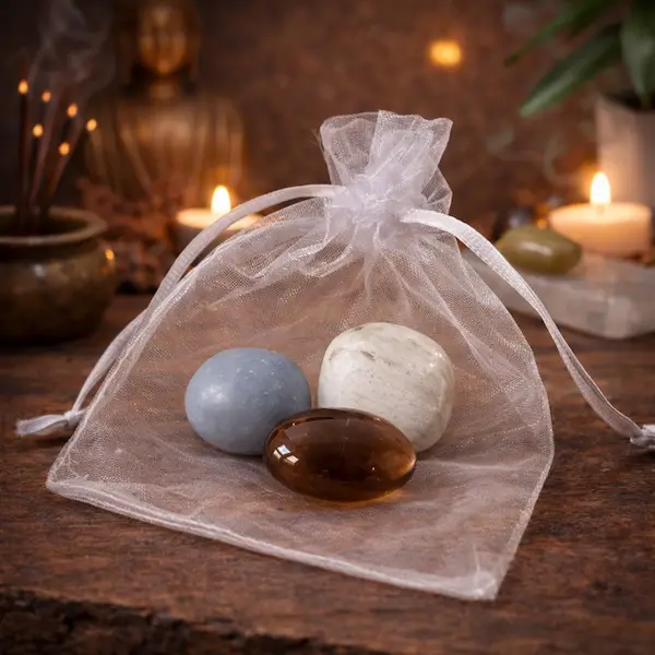 Krystalsættet kan bruges på flere enkle måder i hverdagen. Du kan bære stenene samlet i en pose i lommen eller tasken for løbende støtte til indre ro og stabilitet. Sættet kan også placeres på natbordet, skrivebordet eller et roligt sted i hjemmet, hvor du ønsker en mere balanceret og stabil energi.