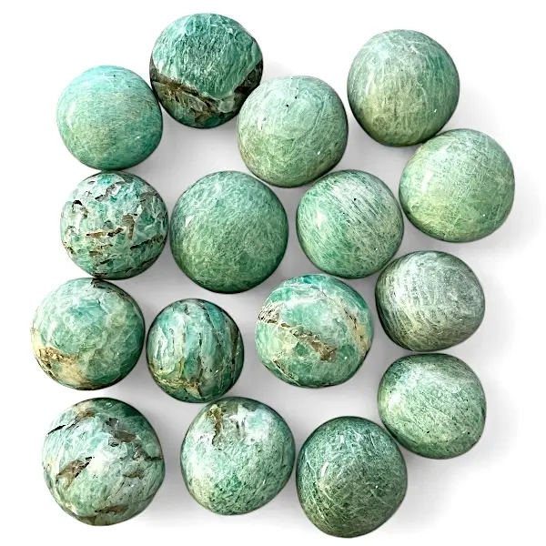 Amazonit lommesten er kendt for deres beroligende grønne nuancer og elegante, lyse striber. Disse smukke, polerede runde sten måler mellem 2,5 og 3 cm, hvilket gør dem perfekte som en lille, men kraftfuld følgesvend i din hverdag. Med en pæn størrelse passer de perfekt i lommen, tasken eller på dit skrivebord, hvor de udsender en blid og harmonisk energi.