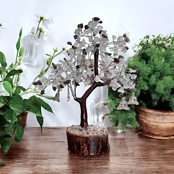 Smukt unikt krystaltræ i ametyst & bjergkrystal med Buddha-charms – ca. 24-25 cm udslået