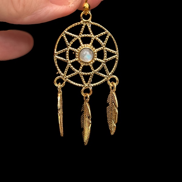 Håndlavede Nikkelfri Spirituelle Drømmefanger Øreringe med Krystaller og Fjer –  Totallængde 5 cm ❤️