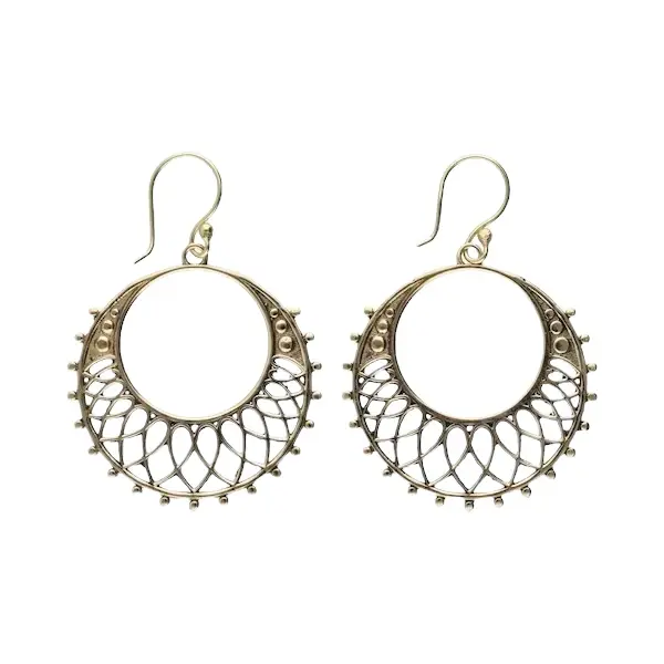 Disse nikkelfri bronzeøreringe i boheme design er skabt til dig, der elsker frihed, æstetik og spirituel symbolik. Med deres smukke mønstre og varme gyldne farve har de en rå, jordbunden elegance, som passer perfekt til både hverdag og ceremonielle øjeblikke. Øreringene måler 3,7 x 5 cm og har den perfekte størrelse til at gøre indtryk uden at dominere.